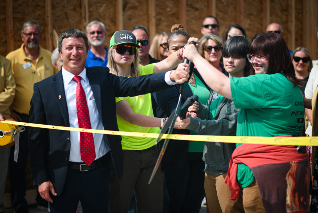At 10:00 am, the crowd gathered around the brightly colored golden ribbon and one giant pair of scissors. Students held up signs on the edge of the crowd as John Scalise, President and CEO of Job Point stepped forward to speak.